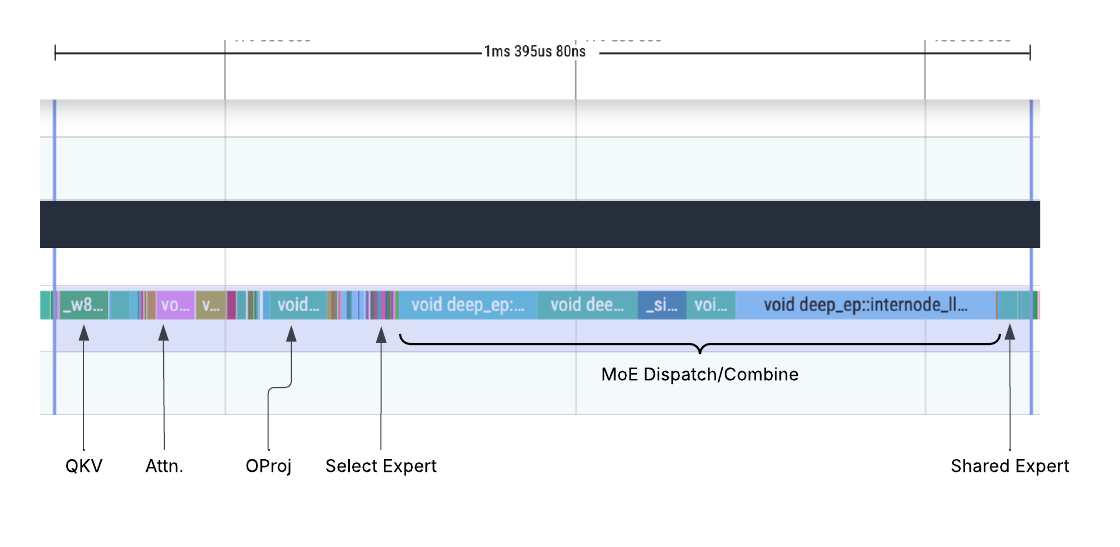Below is a profiling trace from a DeepSeek decode workload without DBO. The “MoE Dispatch/Combine” section shows the outsize duration spent in collective communication, despite the small compute load.