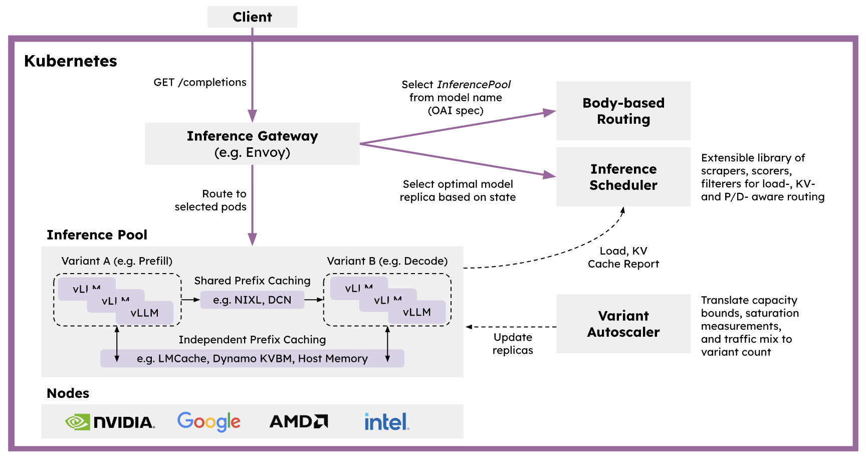 The framework integrates with NIXL and LMCache connectors for efficient KV transfer, and leverages Ray’s distributed computing primitives to enable independent autoscaling of each phase based on load characteristics. Together, the solution provides a flexible and programmable layer for inference workloads that can be easily extended and composed to implement diverse serving patterns.